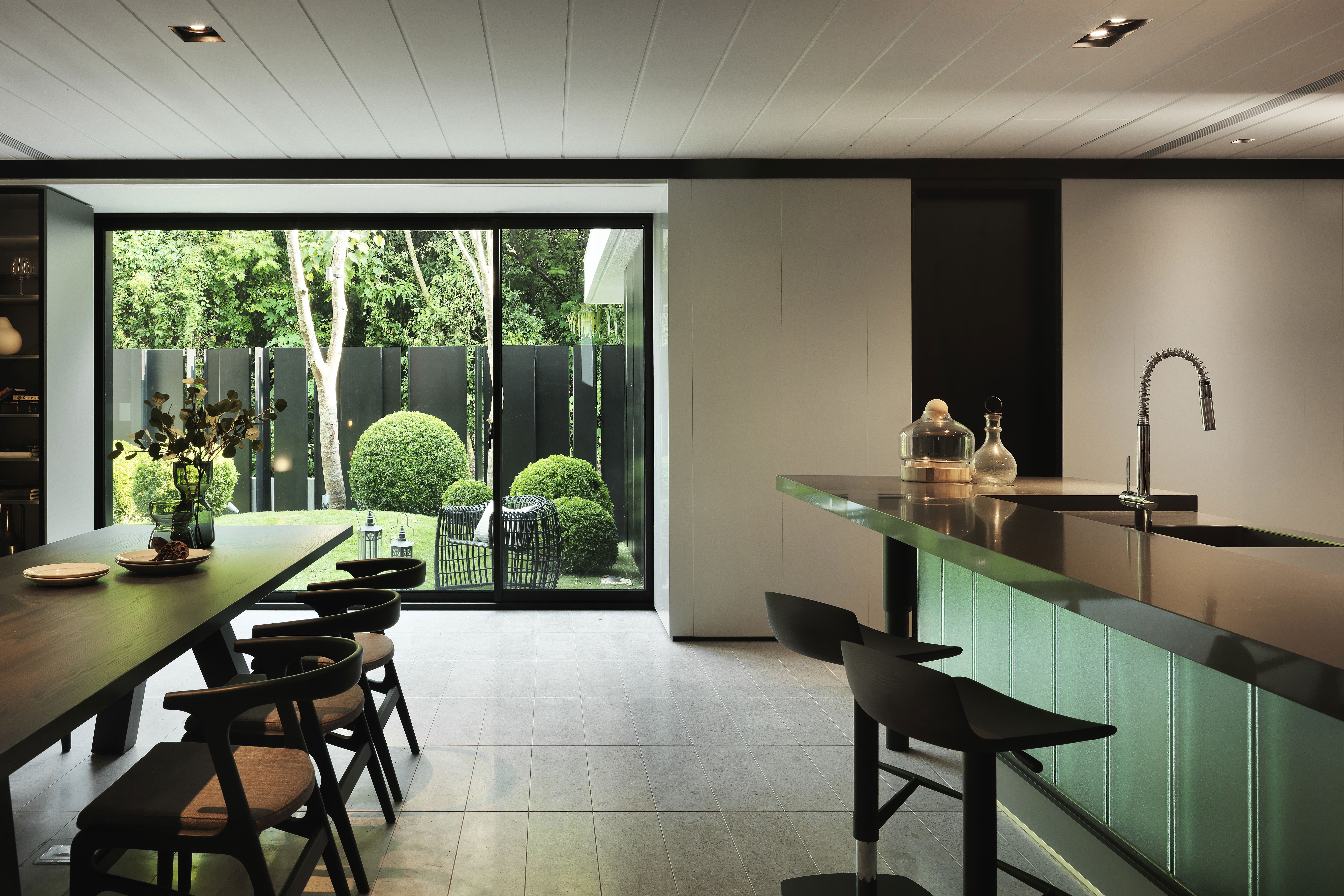 Это-культура и постоянный разговор не всегда идут параллельно. Таким образом, концепция встроенной кухни позволяет опционально и элегантно отвлечь гостя от происходящего. Подобно глубокому коричневому оттенку ЛеКорбюзье, зеленый цвет глазурованного островного блока кухонного бара сливается с более просторной гостиной, как луг - еще и потому, что в его поверхности отражается свежая, настоящая зелень сада! Если для хозяина у плиты это слишком большое присутствие, то у гостя за обеденным столом в гостиной вряд ли создастся впечатление, что он покинул кухню.