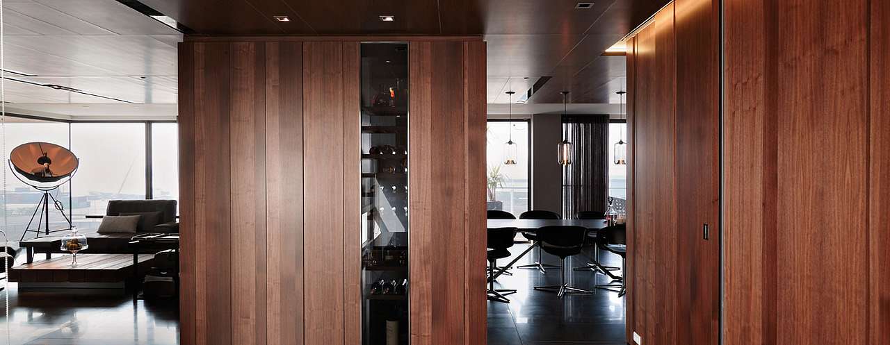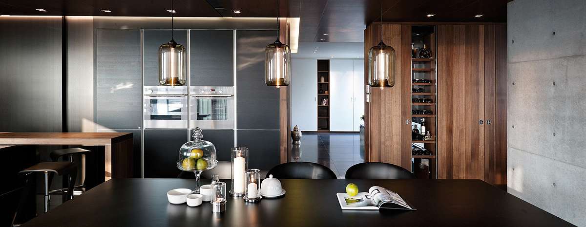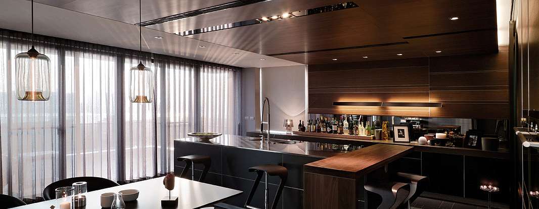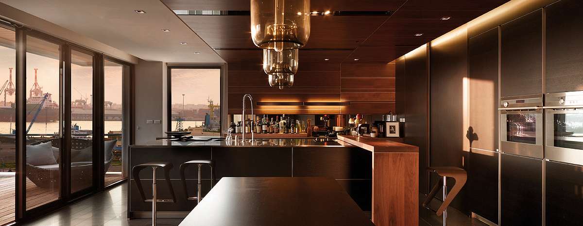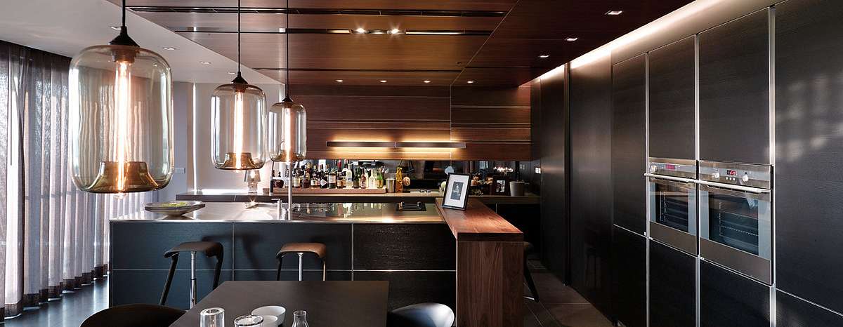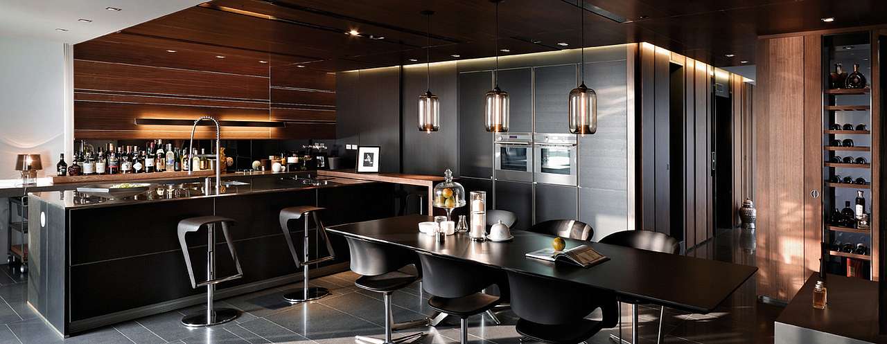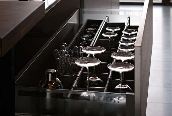 Металлическая окантовка от производителя выделяет антрацитовые фронты, изготовленные из натурального дуба. Вертикальные металлические ручки-планки как бы делят поверхность. Потолок обшит массивом из грецкого ореха. Столешницы изготовлены из нержавеющей стали, которая придает им глянцевый блеск. Здесь также имеется бар, который является центром любой вечеринки.