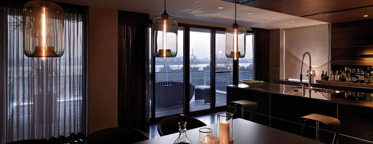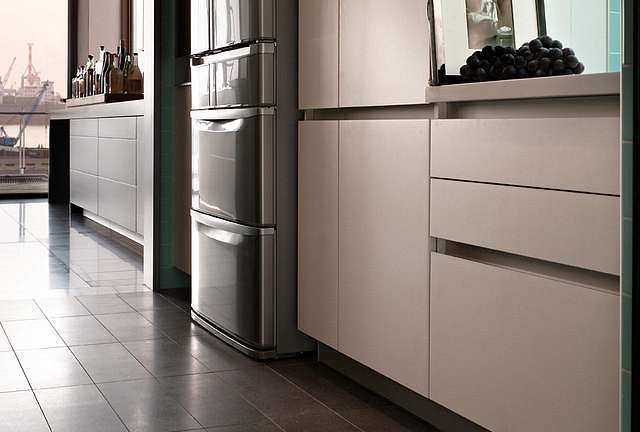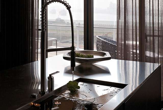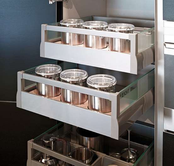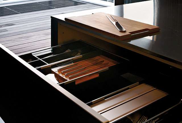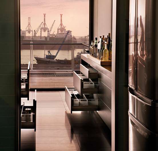 Эта элитная кухня включает в себя как обычный набор кухонных элементов (варочная поверхность, микроволновая печь, духовой шкаф, посудомоечная машина), так и современные стеллажи, тандембоксы. За одним может скрываться целый набор многофункциональных ящиков, островов с мойками и смесителями. Все это имеет единое оформление, что с первого взгляда не поймешь, где заканчивается кухня и начинается жилое помещение.