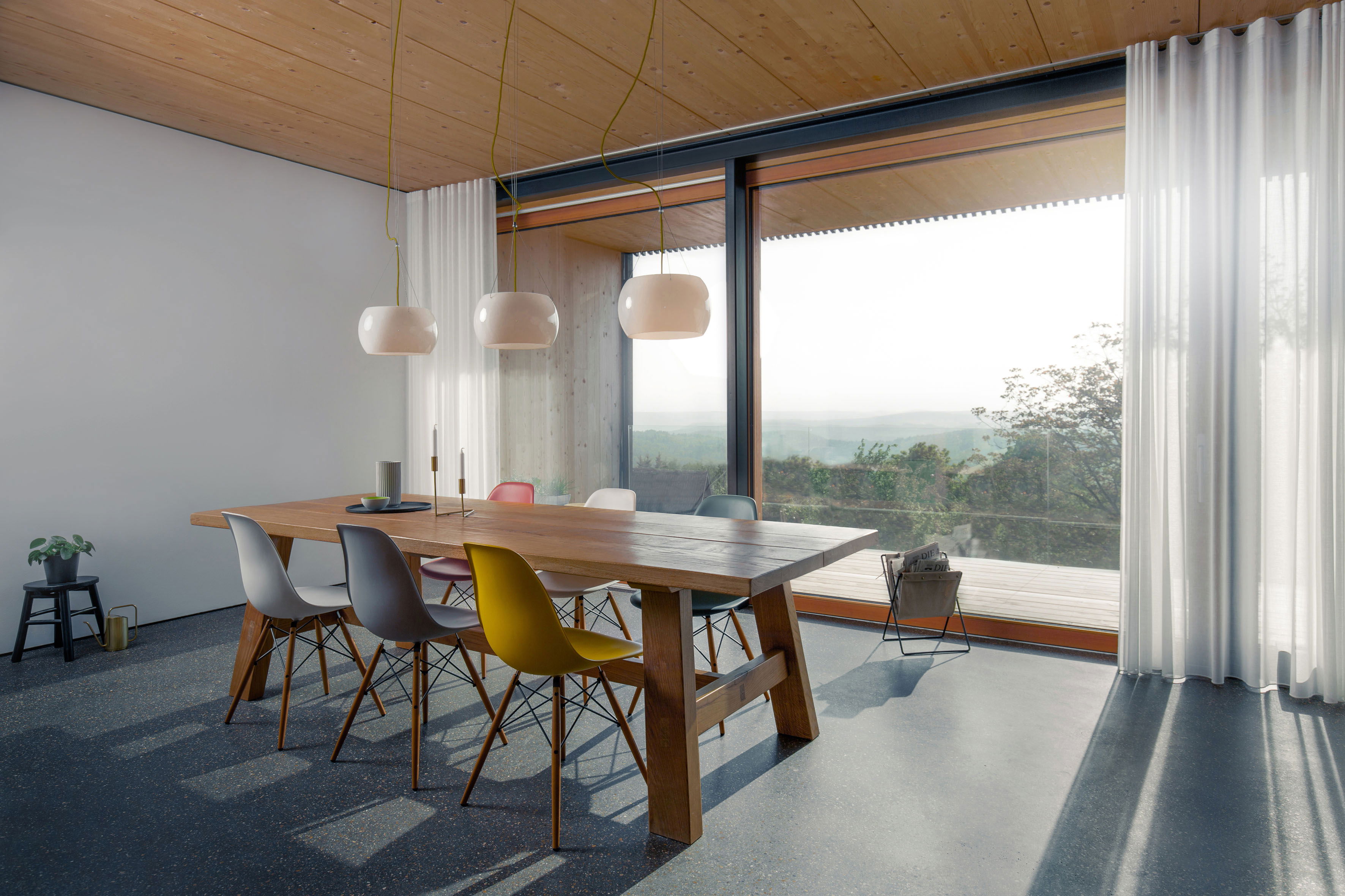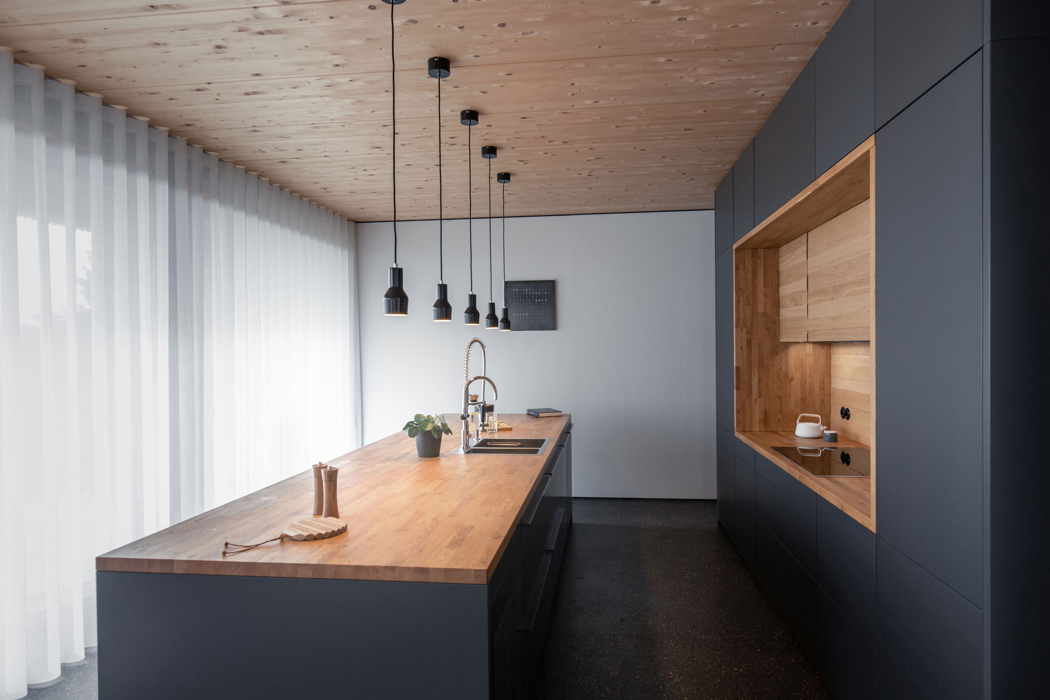 Как только открывается входная дверь и первый шаг делается за порог, возникает совершенно новая, но знакомая картина: из черного монолита в гостеприимный семейный оазис. Характеризуясь выбором материалов и цветов, внутри сохраняется ощущение спокойствия и элегантности. Сочетание холодного бетона и теплого натурального дерева является решающим стилистическим элементом - эстетика, которая реализована вплоть до планирования кухни. Куния ЛЕЙХТ без ручек в глубине, баргатисто-математический ответ с ассорти-ментом БОНДИ органично вписывается в общий измененный текст. В соответствии со скульптурным характером дома, расположенный по центру островной блок с широкой столешницей из массива дуба, серо-матовыми, почти черными фасадами и филигранными ручками стоит в центре кухонного пространства - просто домашний и уютный, не пренебрегая четкой архитектурной эстетикой. Места для хранения вокруг островного блока обеспечивают необходимую функцию, что особенно важно для кухни. В конце концов, кто хочет обходиться без любимых кухонных принадлежностей? Как прямое продолжение кухни открытой планировки Лейхт, от небольшой роскошной кухни отходит уютная столовая зона с нежными цветовыми штрихами и привлекательным деревянным столом. Это идеальное место для того, чтобы жить, готовить, просто жить - особенно на лоджии. Захватывающий вид на бескрайние просторы Большого леса привлекает ваше внимание без границ.