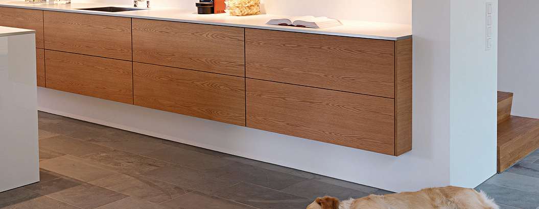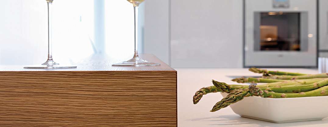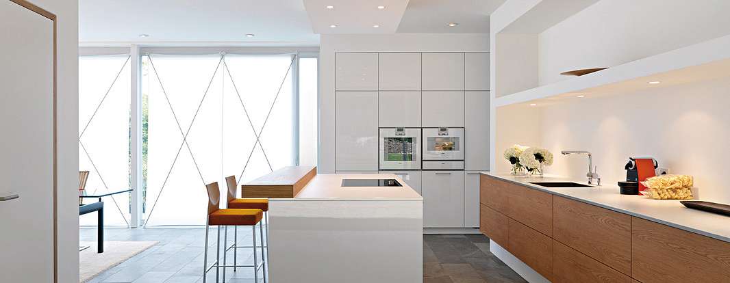 Кухни LEICHT изготавливаются из натуральных природных материалов. Так и в этом проекте полы, мебель, кухонные элементы от производителя сделаны из массива дерева. Цвет дерева контрастирует с белыми глянцевыми поверхностями. За ровными фасадами без ручек спрятана ультрасовременная кухонная техника, а также многочисленные боксы и стеллажи. За счет больших окон, светильников и подсветки помещение наполнено теплым и мягким светом.