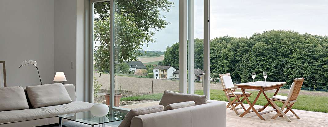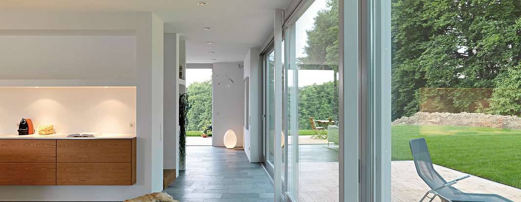 Особенностью проекта кухни КАРЛСРУЭ Германия являются панорамные окна, которые располагаются почти по всему периметру, открывая при этом прекрасный вид на лес.