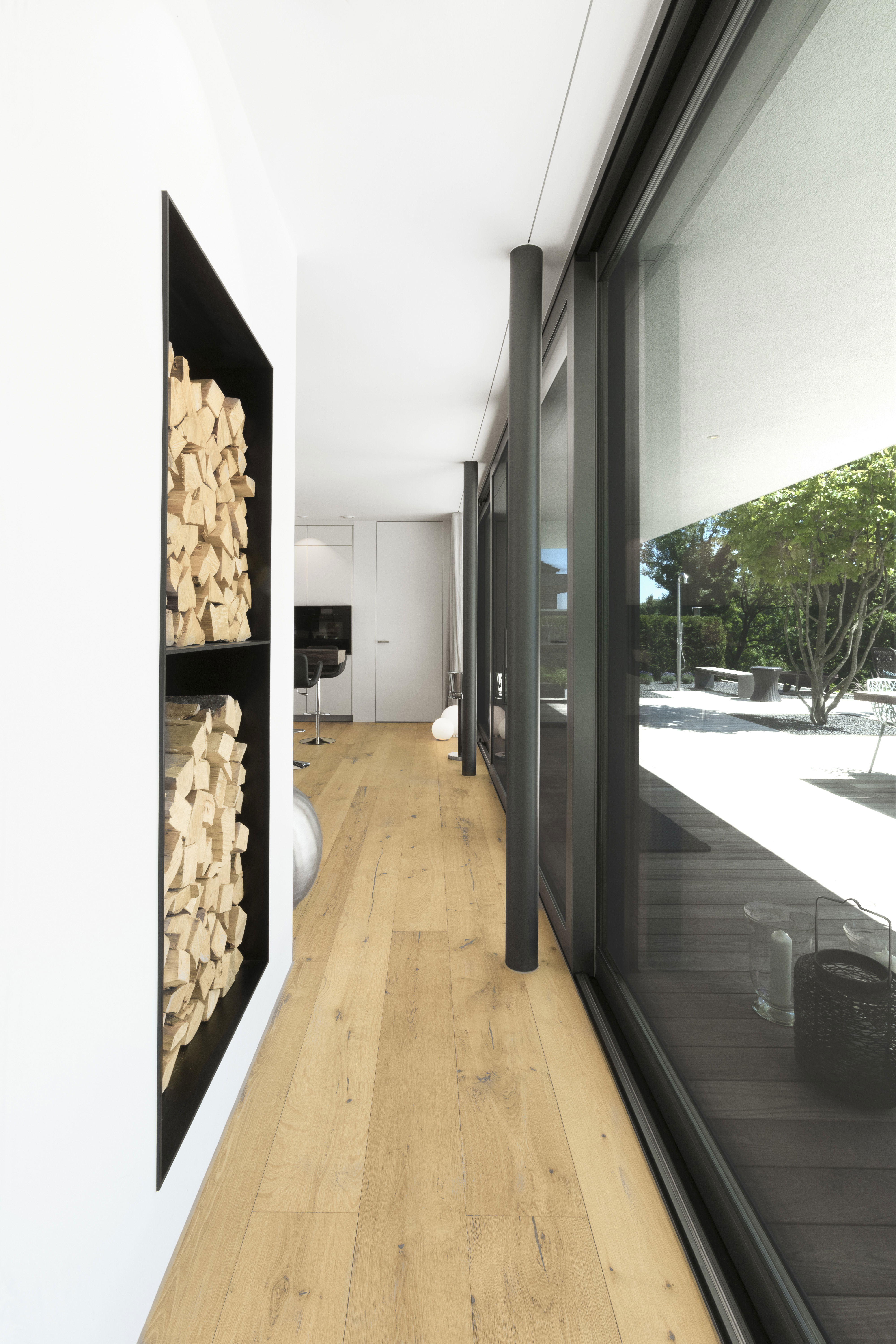 Две дорожки ведут из кухни в жилые помещения дома, которые, в соответствии с концепцией открытой планировки, не отделены друг от друга дверями. С одной стороны коридор ведет вдоль окон от пола до потолка в гостиную, а с другой стороны лестница ведет на второй этаж. В результате получается постоянно открытая пространственная структура - идеальная для семейной жизни. Выбор цветов и материалов также является последовательным: Деревянные полы, белые стены и мебель, изредка темные контрасты. Ванная комната расположена на верхнем этаже и напоминает оздоровительный оазис. Необычным украшением комнаты являются отдельно стоящая ванна, из которой - один раз два окна от пола до потолка - можно посмотреть на природ и с представляем вашему вниманию фильм о Вольтеровской группе и легенд "Баугаусе".