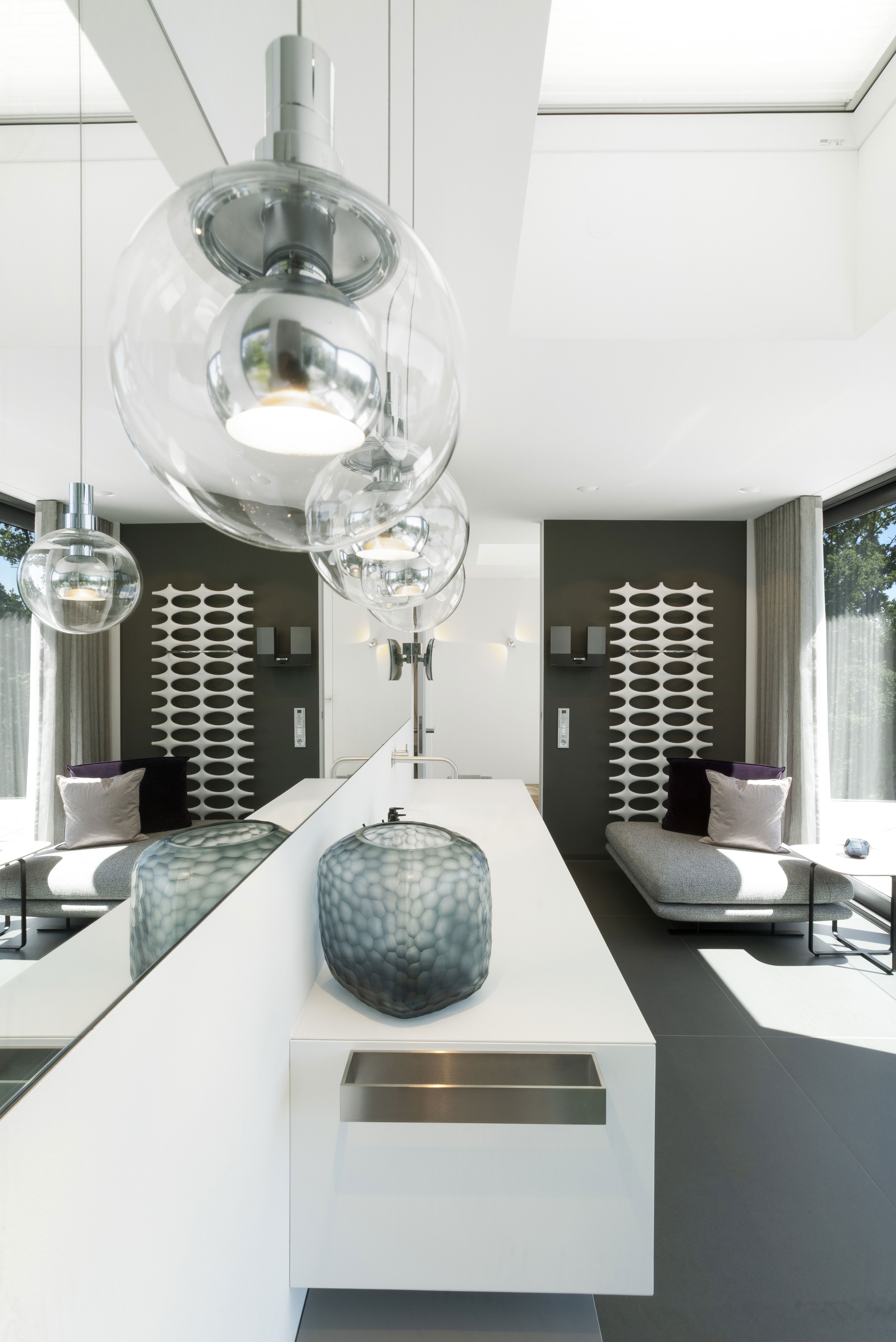 Но давайте вернемся к жизни: В окруженные зеленью и прямо на воде недалеко от Августбурга в Германии вы можете найти семейный дом, принадлежащий к классу себе подобных. Такая четкая в своей архитектуре, такая строгая в своей форме: Плоские стеклянные фасады, ярко-белый фасад и структура из двух кубов, расположенных со смещением друг над другом, придают зданию выразительный характер. Шторы от пола до потолка и слегка тонированные стекла создают приватность в современном здании. Те, кто здесь живет, ценят дизайн вещей: Их дизайн, а также их функции. Несложно догадаться, кто послужил примером для подражания этой архитектуре: Баухаус бил и остается музой 21 века.