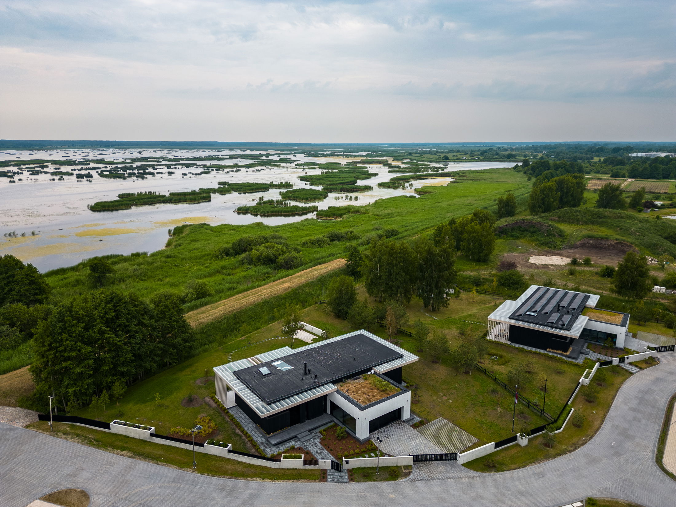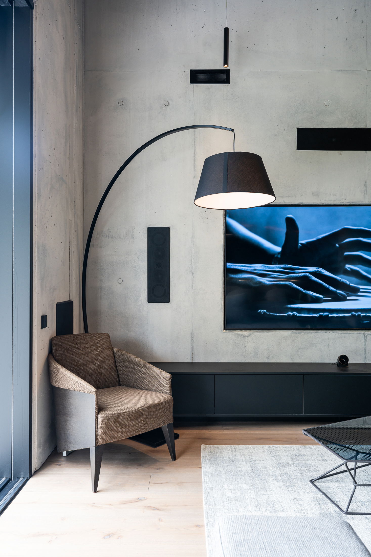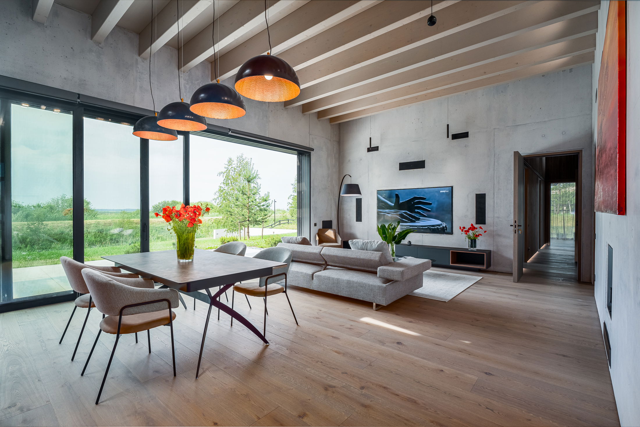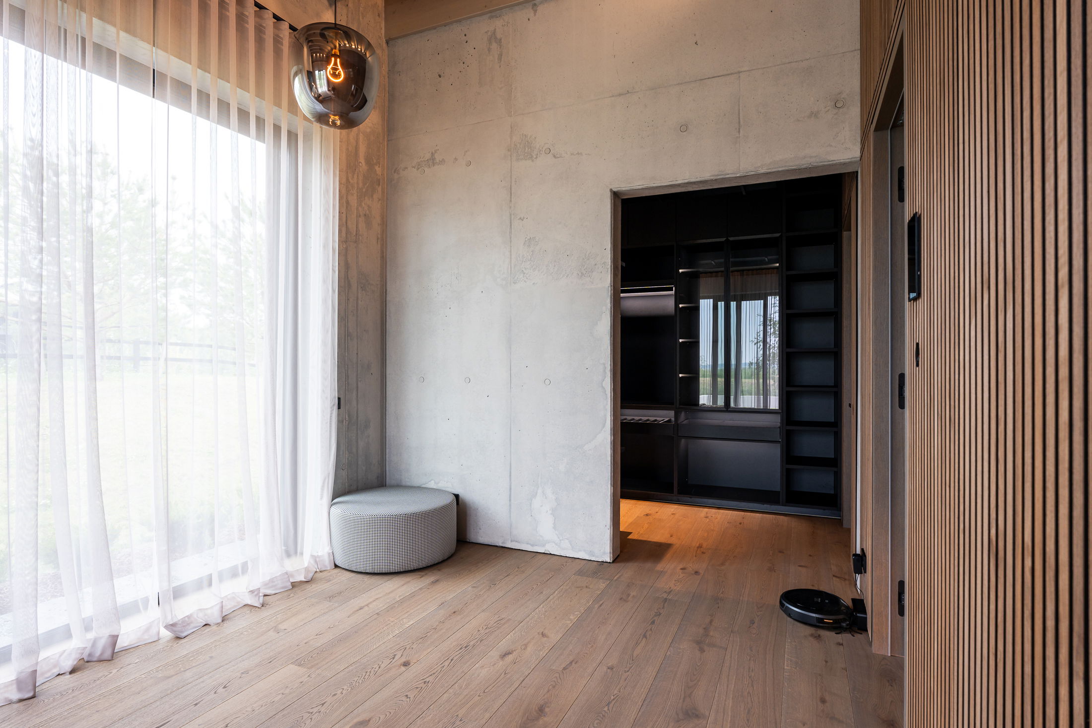 В тихом месте недалеко от столицы Латвии Риги находится современное жилое здание, архитектурная концепция которого характеризуется умелым сочетанием вертикальных конструкций как в дизайне фасада, так и в интерьере. Его внешний дизайн демонстрирует тонкий баланс между современным архитектурным языком и природным окружением, в то время как в интерьере гармонично сочетаются деревянные и бетонные элементы.