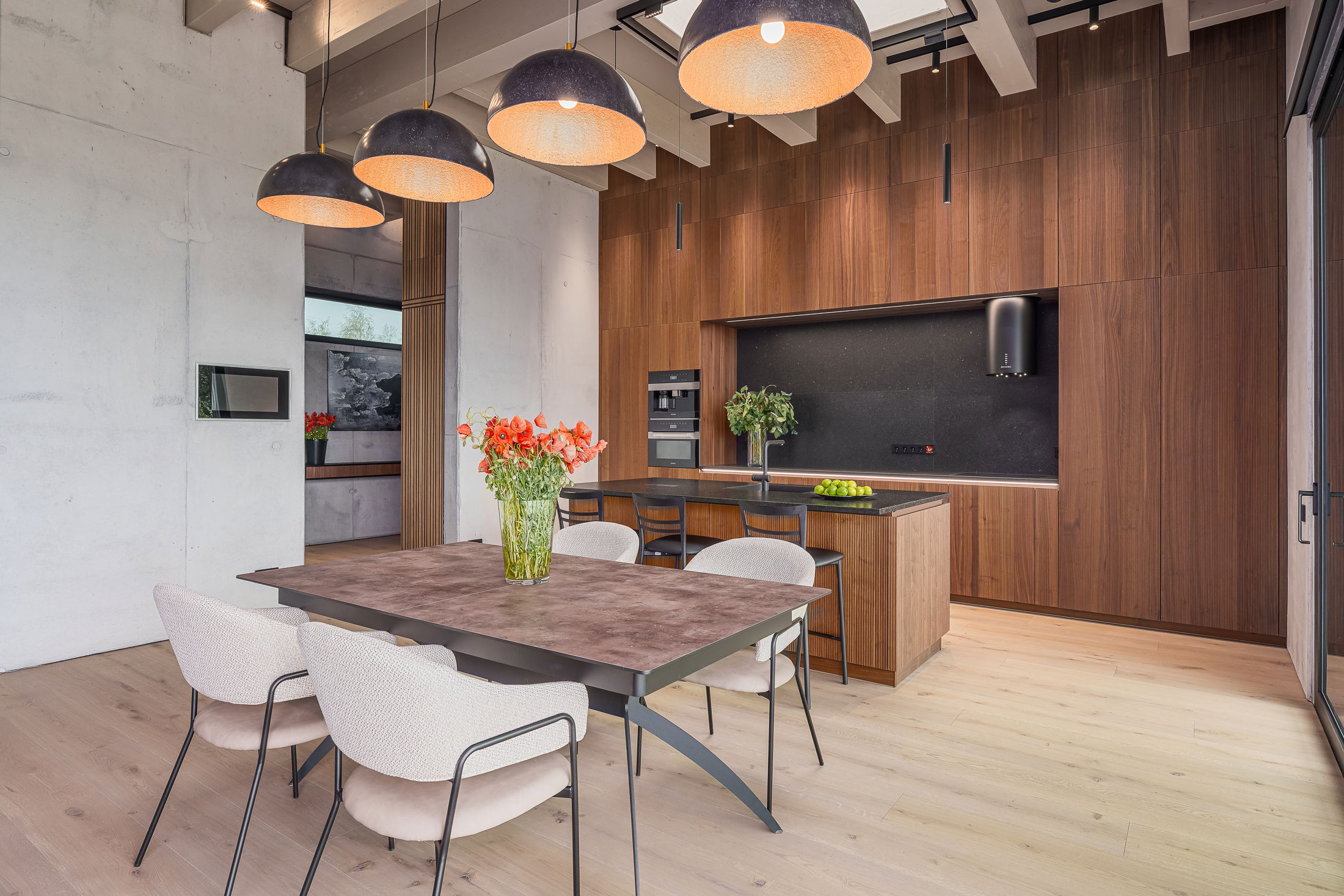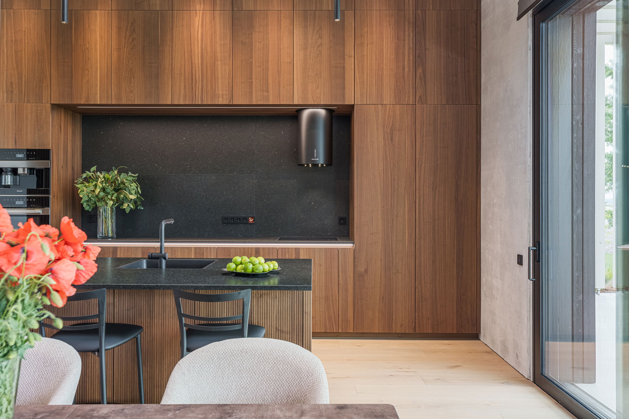В интерьере дома используется удивительное сочетание материалов: сочетание прохладных, гладких бетонных поверхностей и теплого характера дерева создает захватывающую гармонию. Это взаимодействие материалов отражается в каждой детали и создает атмосферу, которая одновременно является современной и располагающей. Программа отделки поверхностей BOSSA отражает этот феномен материала с его характерной структурой и высококачественными деревянными фасадами. Встроенная в кухню система BOSSA гарантирует, что это пространство больше не воспринимается как функциональная зона, а как неотъемлемая часть общей концепции жизни. Кухня - это не просто место для приготовления пищи, но и место встреч, которое объединяет людей и приглашает их задержаться.