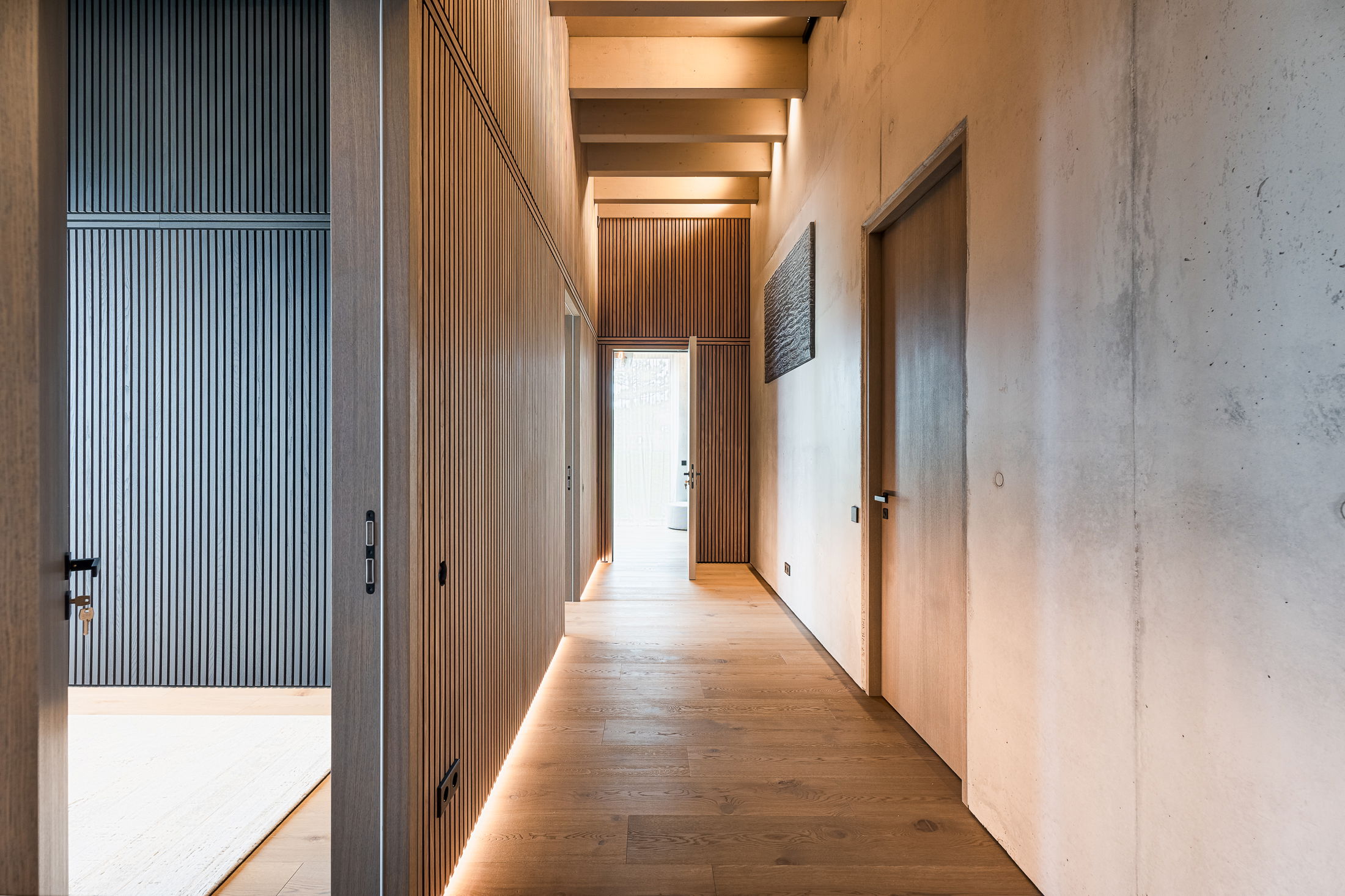 Остальная архитектура здания также демонстрирует баланс между прочностью и теплотой. Вертикальные конструкции используются не только на кухне, но и в прилегающих помещениях. Это последовательное дизайнерское решение создает баланс в дизайне интерьера и единый внешний вид всего здания. Дерево и бетон, два контрастирующих материала, гармонично сочетаются, создавая пространство, неподвластное времени, но в то же время поразительное.