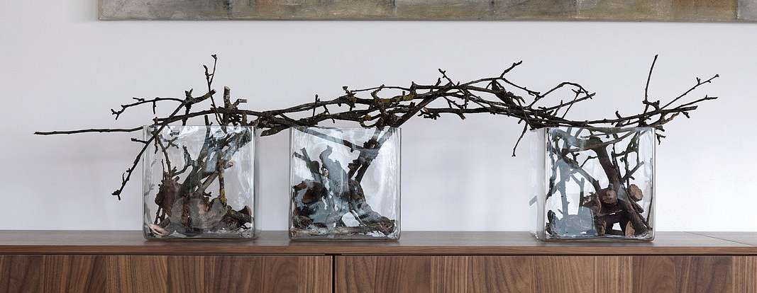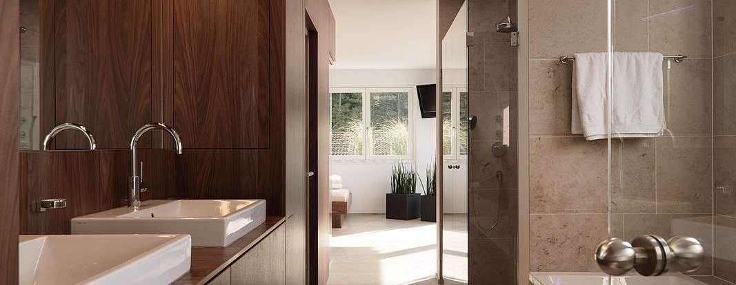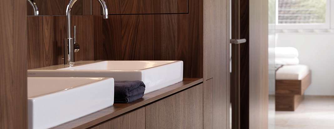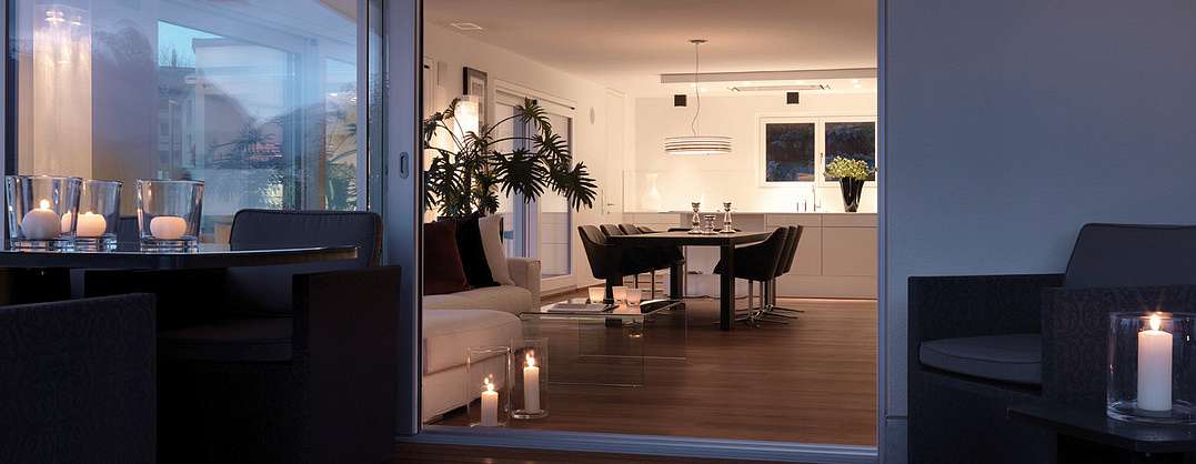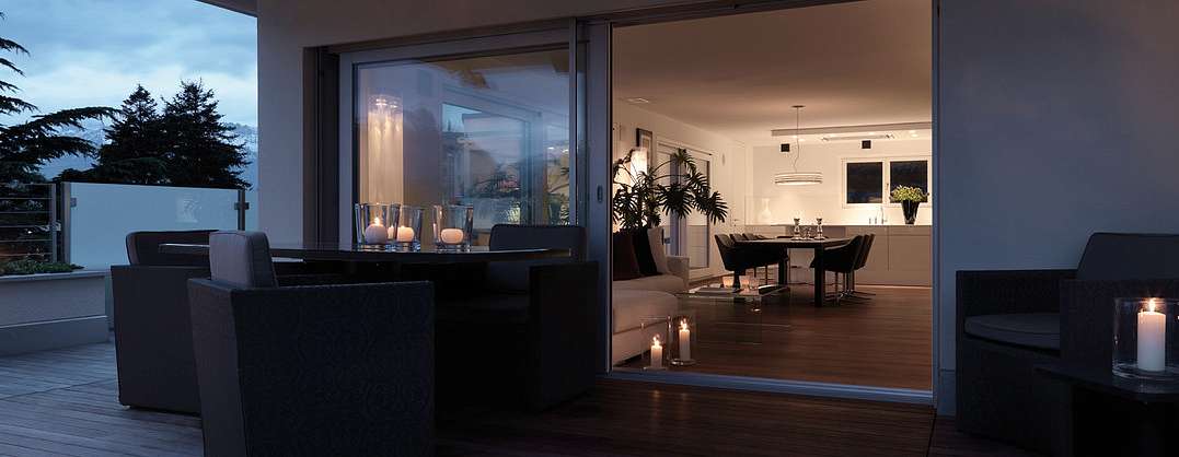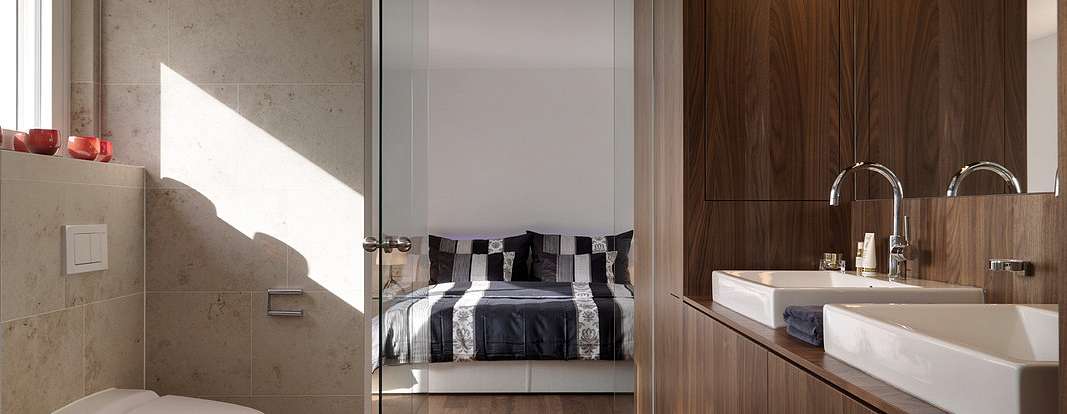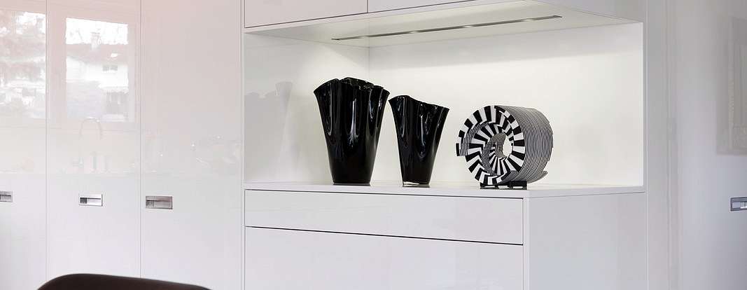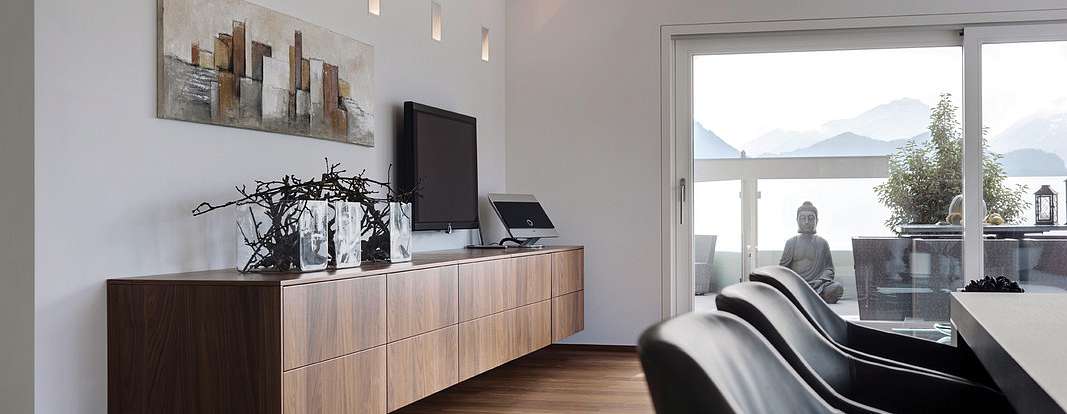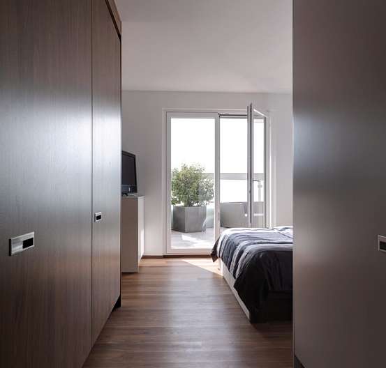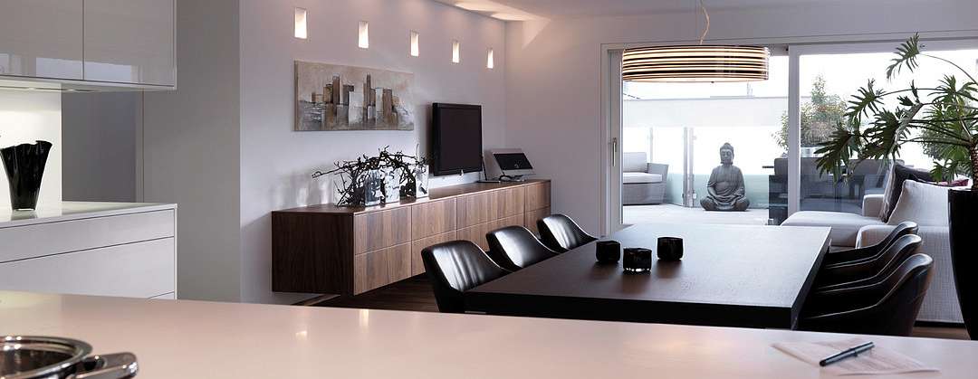 Переходы между комнатами подчеркнуты с помощью угловых шкафов от производителя, опоясывающих стены. В них интегрирована вся необходимая техника. Эти шкафы плавно перетекают в гардеробные. Последние оборудованы раздвижными дверями, высота которых подчеркнута с помощью врезанных ниш. Из кухни LEICHT можно сразу попасть на террасу, где можно коротать теплые вечера и любоваться закатом.