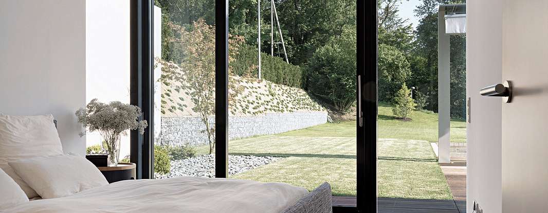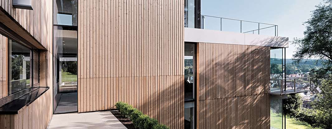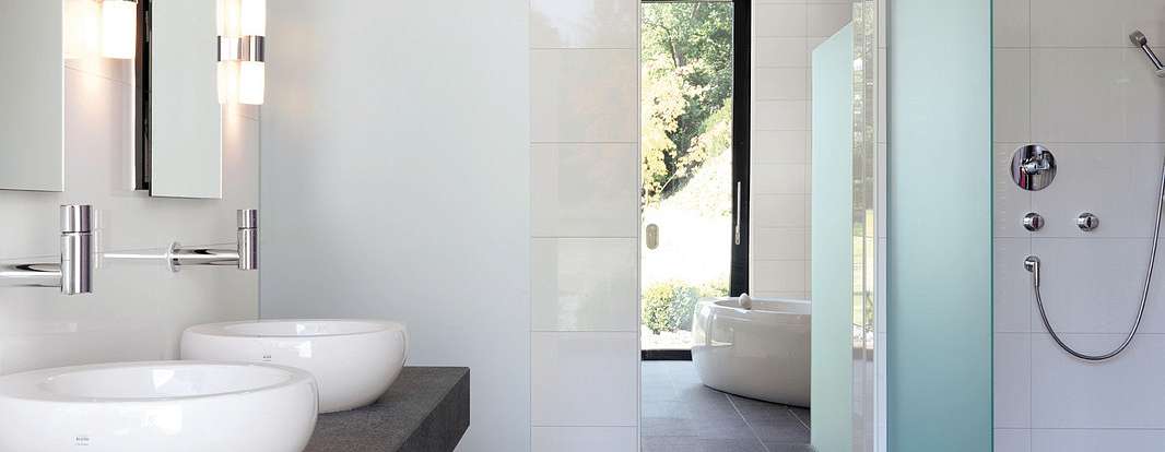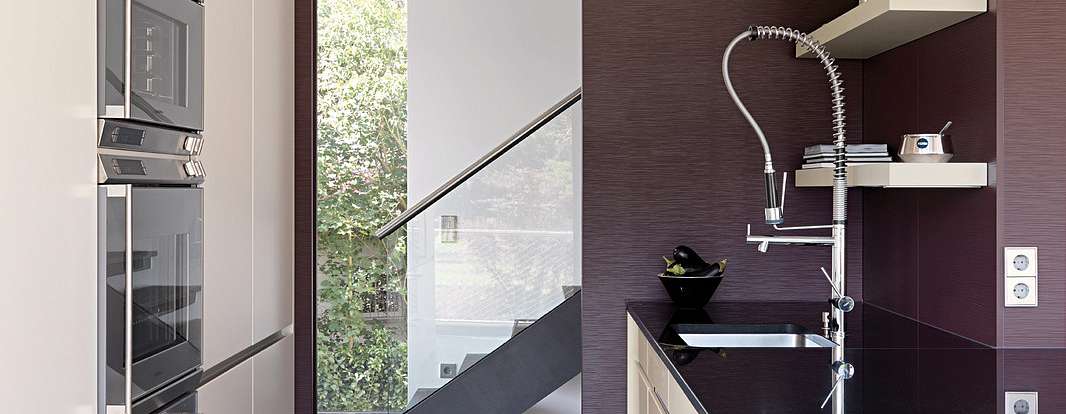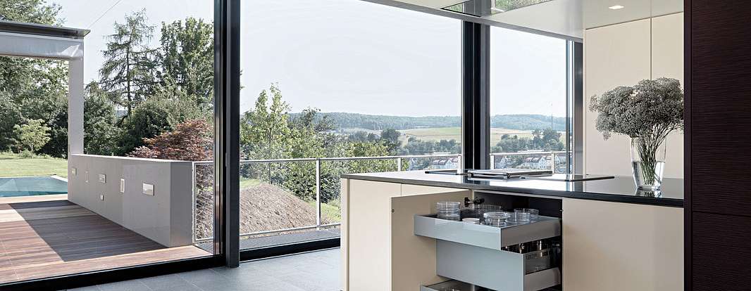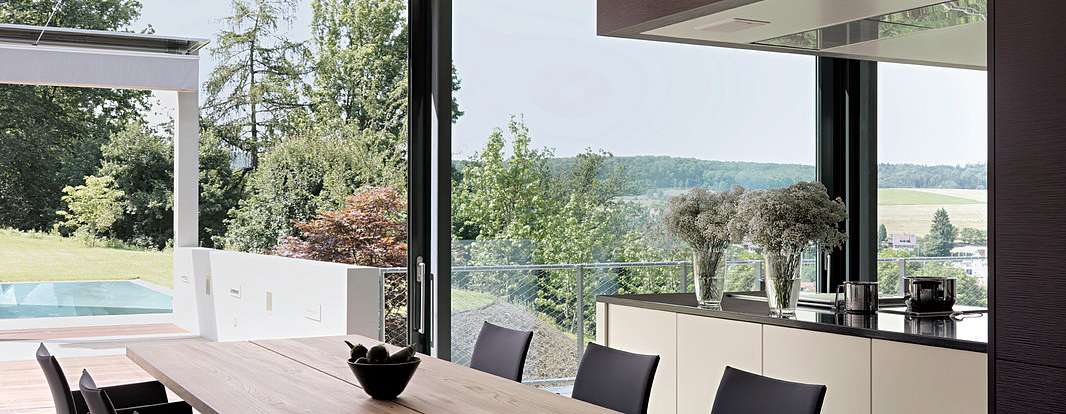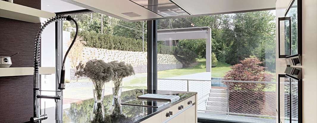 С южной стороны здание закрыто для того, чтобы было место для больших шкафов от производителя и модулей со встроенной техникой. Прямо из кухни можно выйти на лужайку или к бассейну.