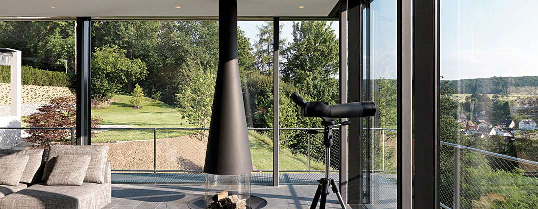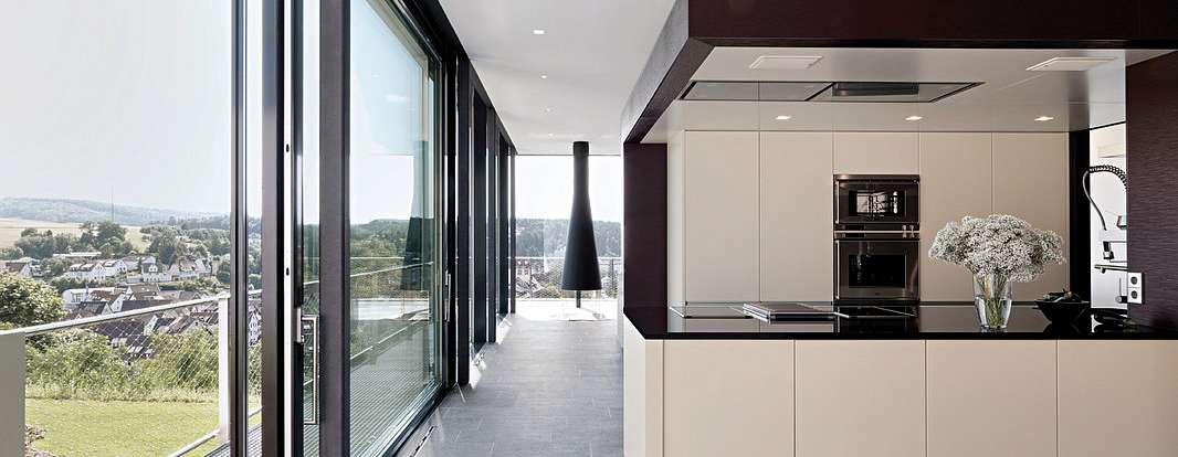 Этот кухонный комплекс LEICHT представляет собой двухэтажное здание, с двух сторон которого располагаются огромные окна - от пола до потолка. Отсюда открывается невероятный вид на леса, поля и луга. Это самостоятельный архитектурный объект, наполненный всем необходимым. Стиль этого помещения - Modern, для которого так характерны четкие линии, монохромность, обилие современной техники. Весь интерьер выдержан в белой и черной гамме. Здесь повсюду теплое дерево и холодный камень.