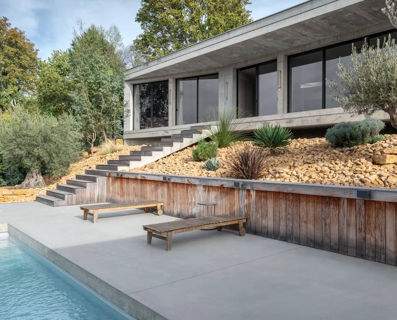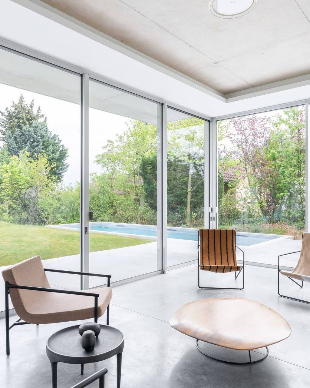 Дом построен вокруг просторной и светлой гостиной, оформленной системой Saint-Germain, журнальными столиками Koishi и креслами Le Club.