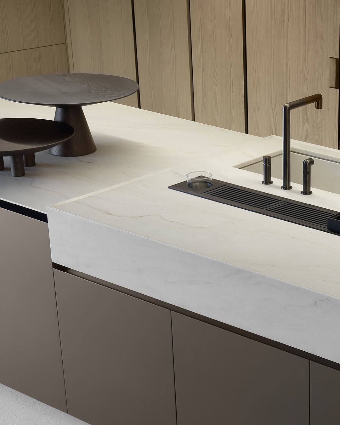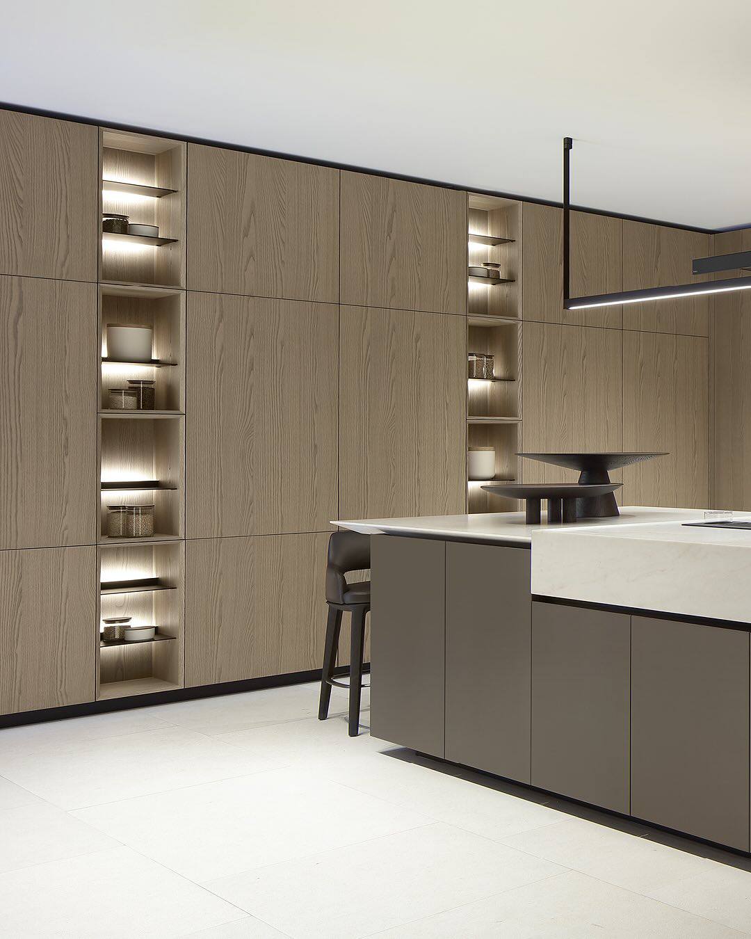Смелая геометрия, изысканные пропорции и скульптурные объемы. Среди инноваций — скошенный край столешницы, интегрированные ручки и парящая барная стойка. Новый стандарт высокой интерьерной архитектуры.