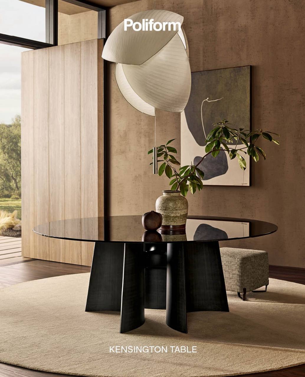 Обеденное пространство строится вокруг стола Adrien со скульптурными асимметричными ножками и столешницей из дерева или мрамора. Стулья Leopold от Poliform с деревянным каркасом и мягким объёмным сиденьем обеспечивают комфорт и элегантность. Шкаф Duke добавляет строгие линии и функциональное хранение, создавая ощущение завершённого и гармоничного интерьера.