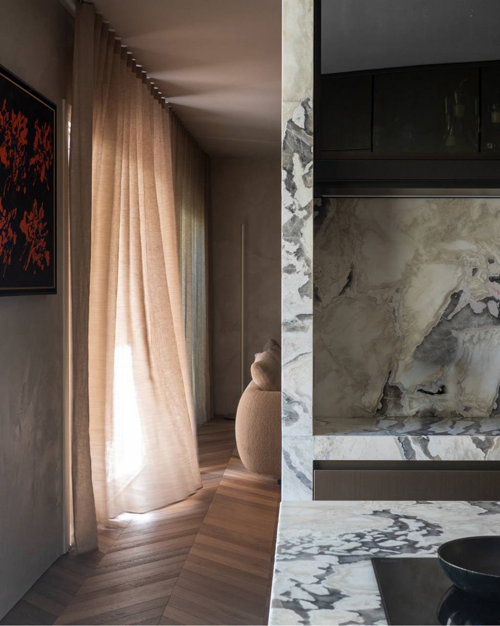 Мраморная перегородка отделяет кухню Poliform, представляющую собой лаконичный функциональный гарнитур, от гостиной. Здесь выделяются диван Saint-Germain с мягкими линиями и столики Koishi с органичным силуэтом. В ночной зоне аксессуары Poliform продолжают тему утончённости.
