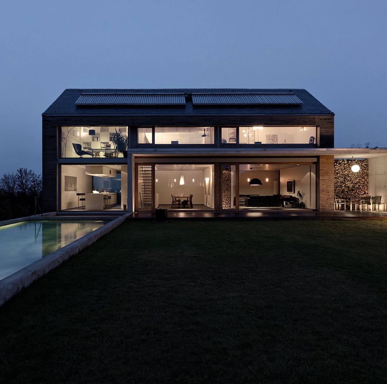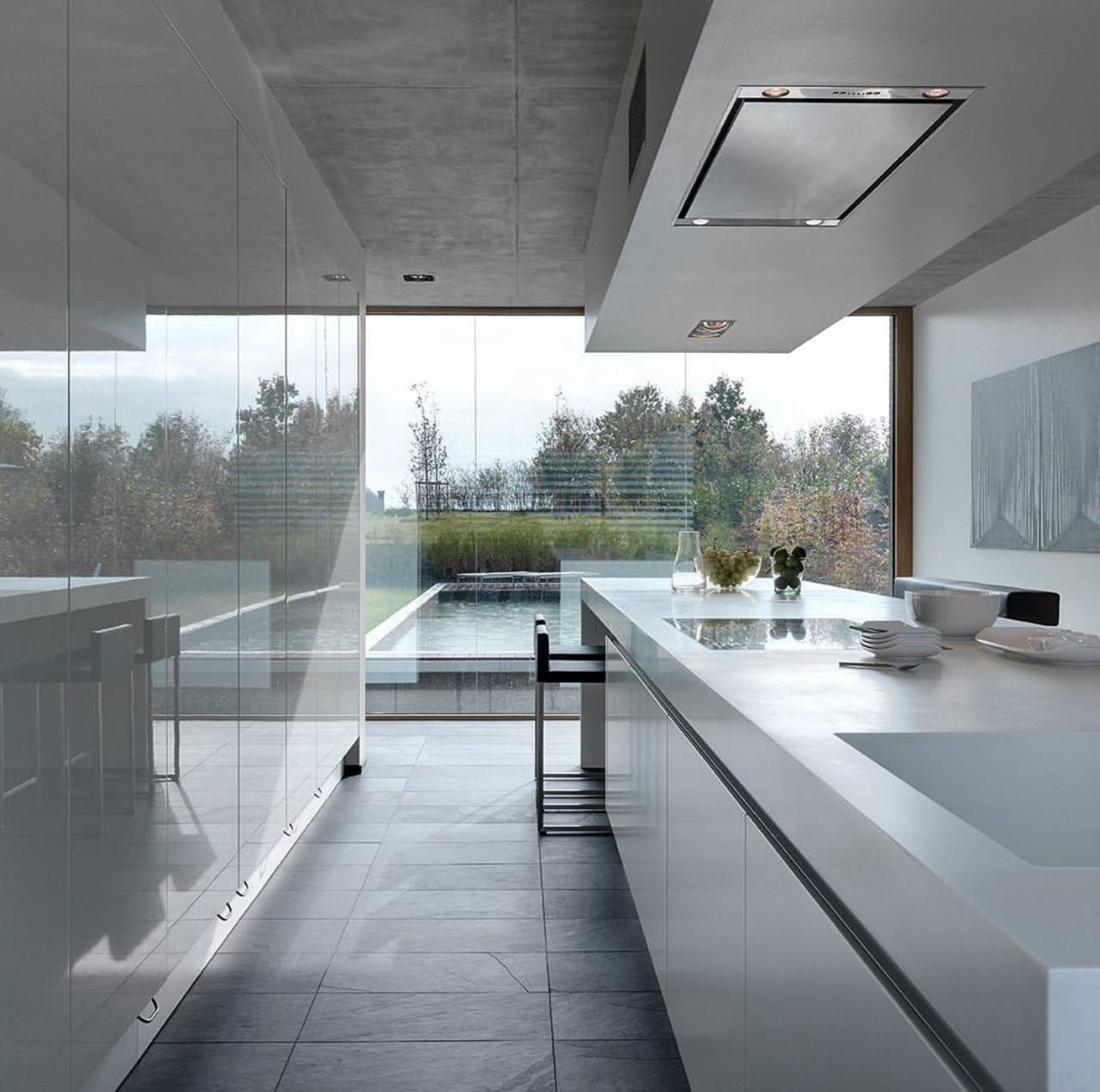 Кухня Leicht в Бельгии выполнена в минимализме с белыми глянцевыми фронтами и полностью скрытыми элементами. В центре расположен остров с массивной белой столешницей и встроенной раковиной. Контрастным акцентом служит черная варочная панель с удобной LED-подсветкой.