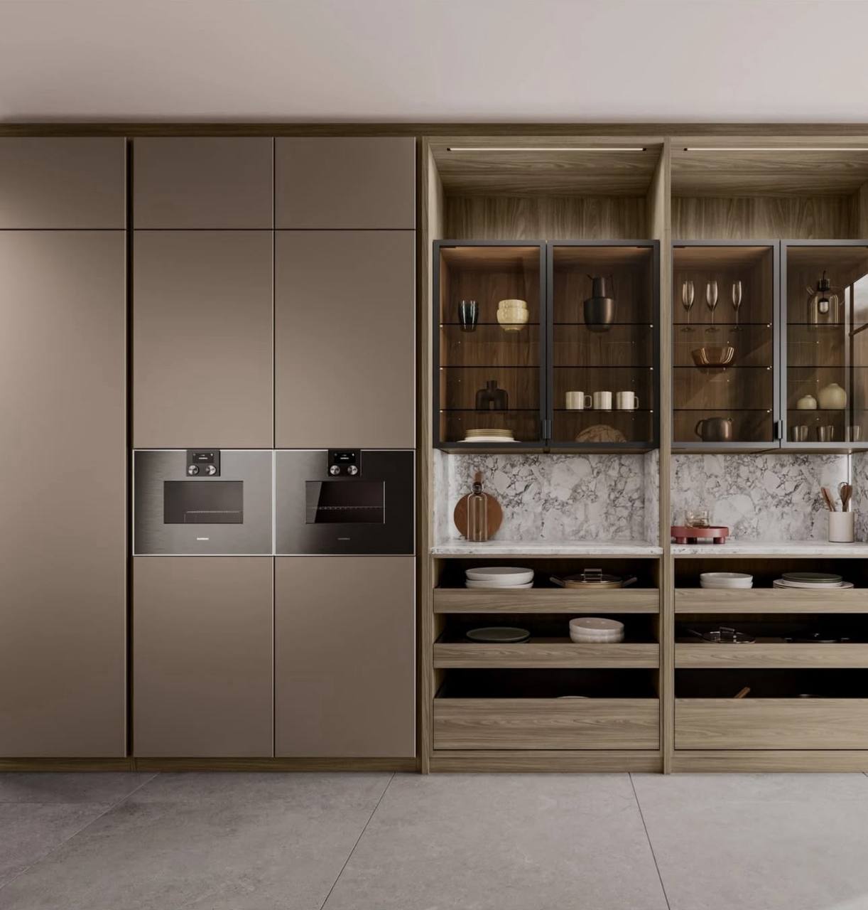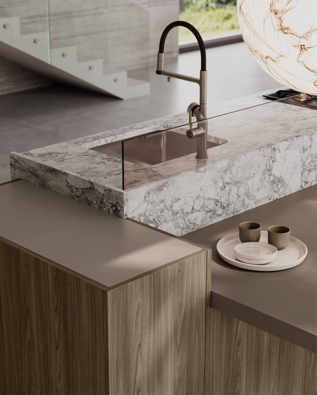 Кухонный остров с тёплыми фасадами в оттенке almond grey и изысканной столешницей из мрамора white fantasy sanded создаёт спокойный, но выразительный акцент в пространстве.