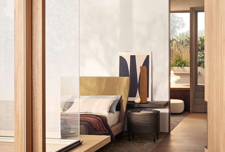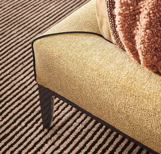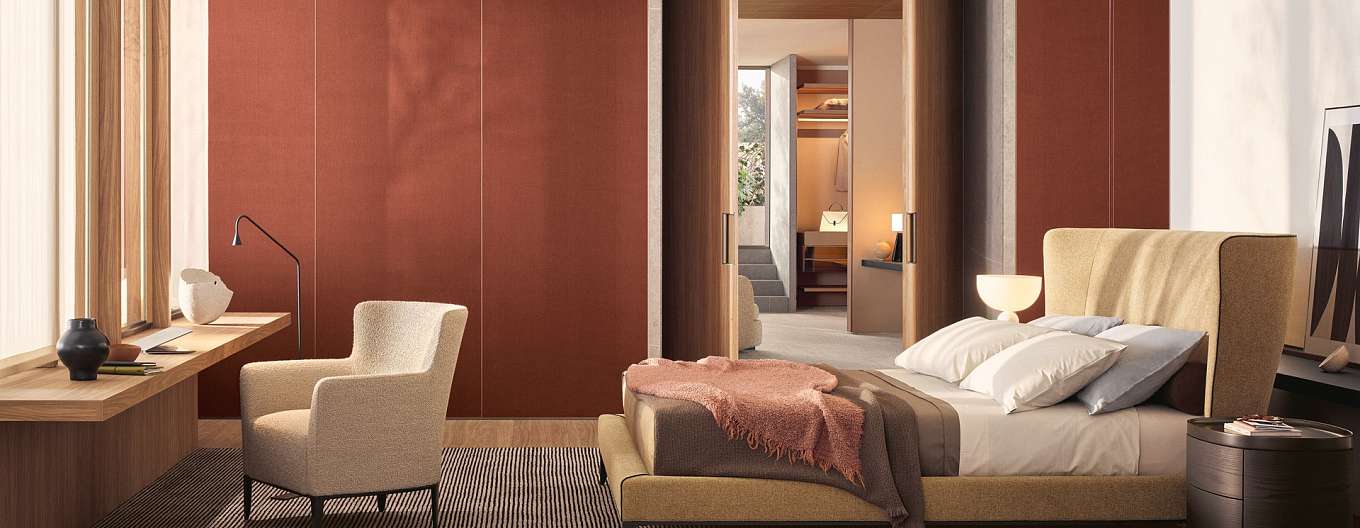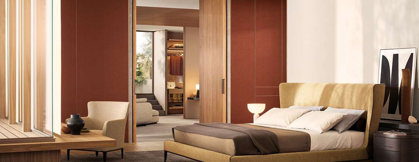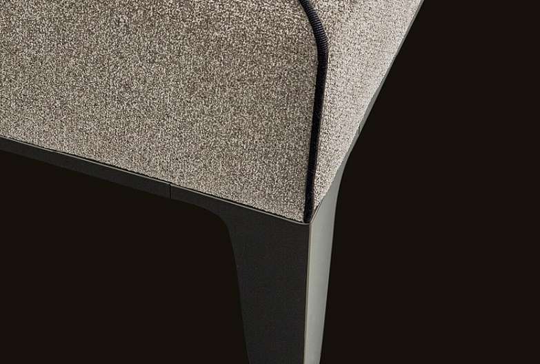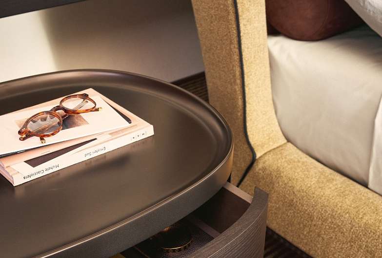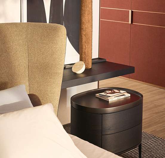 Главным героем серии Gentleman Night Collection выступает кровать, которая перекликается с настроением и эстетикой коллекции мебели для гостиной. Плавные линии широкого изголовья, которое украшают изысканные детали, например окантовка периметра репсовой лентой, напоминают приподнятый воротник пиджака. Кровать возвышается на тонкой и элегантной ножке с никелированной отделкой темного цвета или цвета Champagne.