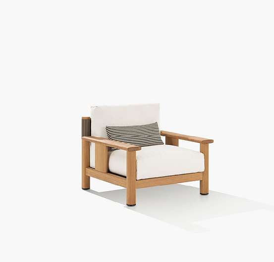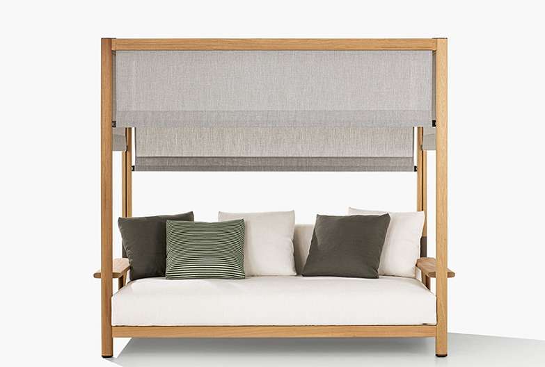 Для коллекции Ketch Жан-Мари Массо черпал вдохновение в морском мире. Подобно парусу, натянутому между двумя мачтами лодки, гибкая спинка диванов и кресел опирается на простую и прочную конструкцию из массива ироко, очень прочного дерева, обработанного гидромаслами, которые сохраняют свою красоту с течением времени. Подушки, изготовленные из специальных материалов и тканей для использования на открытом воздухе, просторны и удобны. В версии с балдахином ножки дивана выдвигаются, создавая микроархитектуру с занавесками, интимный, сдержанный и защищенный уголок.