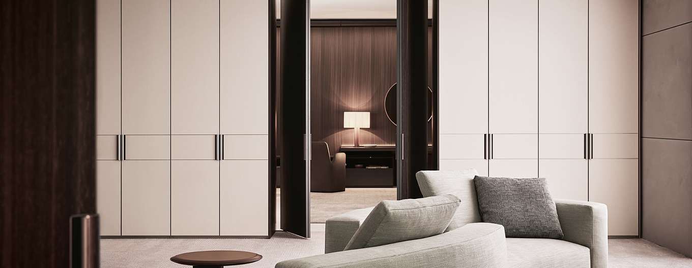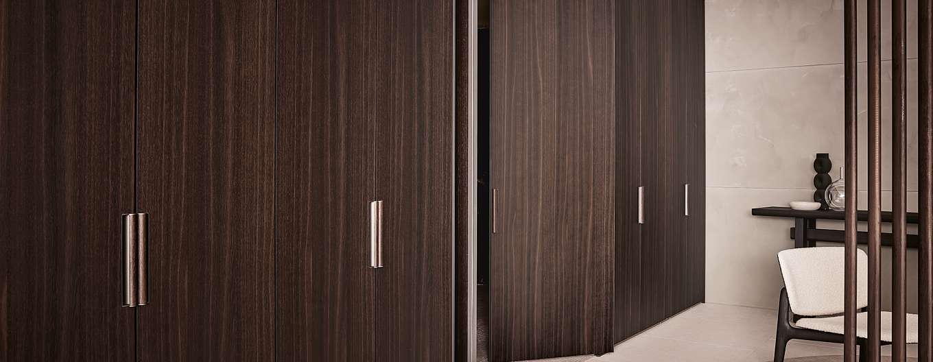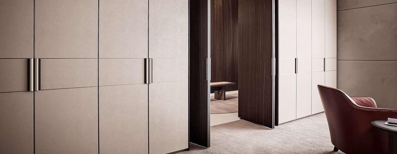 Senzafine Match - это новая дверь модульной системы Senzafine для спальной зоны, обладающей бесконечными эстетическими и функциональными возможностями. Дверь Match представлена в нескольких вариантах: в деревянном исполнении с ручкой в тон, покрытой деревом; в варианте Tecnocover с ручкой в тон с покрытием Tecnocover; в варианте из ткани и в лакированной отделке с металлической ручкой в цвете ardesia или champagne. В вариантах из ткани и с покрытием Tecnocover дверь дополнена тонкими окрашенными металлическими поперечинами.