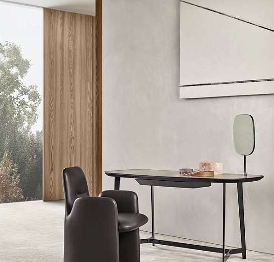 Mathieu — это современный письменный стол с тонким силуэтом и изящным профилем. Грациозные изгибы столешницы с деревянной рамой и кожаной вставкой смягчают строгие линии окрашенной металлической конструкции. Элегантные и сдержанные дополнительные аксессуары — небольшой ящик под столешницей и зеркало — превращают стол в идеальное дополнение любого кабинета или спальни.